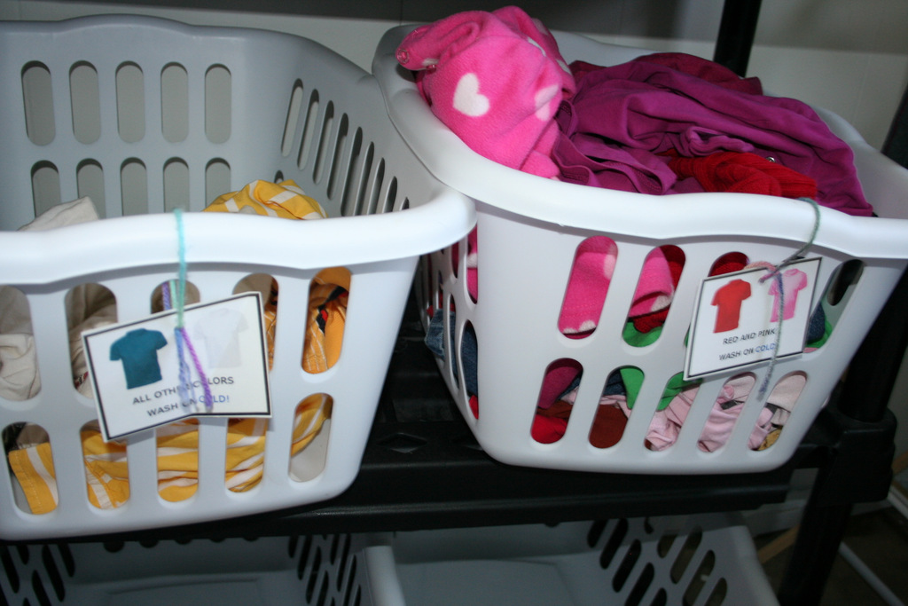 The baskets are labeled. Bottom row is for clothes to be washed on warm.
